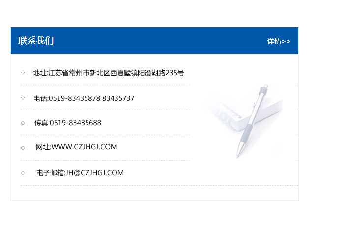 地址:常州市新北區友邦商務大廈1幢16、17層  電話:0519-85101652  傳真:0519-85112595  郵編:213022  網址:www.cz-jiayue_cn.pm1188.com  郵箱:xiajifengaa@163.com